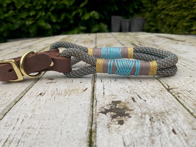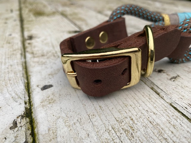 Das Halsband Eddie ist aus braunem Fettleder und braunem Tau mit türkiesen Punkten gefertigt. Der Verschluss und die Beschläge sind hochwertig und in gold/messing farben.
